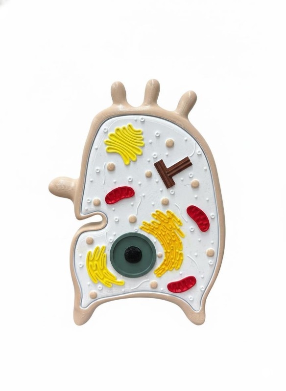 Модель демонструє будову тваринної клітини – зовнішню та внутрішню, а також її органели.