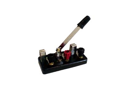 Перемикач необхідний для замикання та розмикання електричних ланцюгів в процесі лабораторного дослідження з електродинаміки. Він виконаний у вигляді ножа з рукояткою, який закріплений на пластиковій основі. Для можливості підключення електричного ланцюга передбачено три клеми.