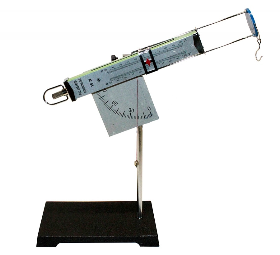Основною складовою частиною приладу є двосторонній динамометр. Межі вимірювань ±10Н, ціна поділки – 0,2Н. Уздовж шкали пересувається вказівник зі стрілкою. Прилад має круглу площину з двома штирями для встановлення снаряда. Для визначення кута нахилу прилад оснащений транспортиром.