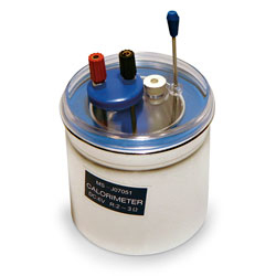 Завдяки наявності спіралі-резистора калориметр забезпечує можливість автономного нагріву води безпосередньо у середині приладу. На верхній частині колодки передбачені клеми для підключення джерела живлення. Зовнішній стакан доповнений вставкою з теплоізолюючою речовиною, яка зменшує витрати та обмін теплової енергії з навколишнім середовищем. Для виготовлення внутрішнього стакана використовується алюміній.