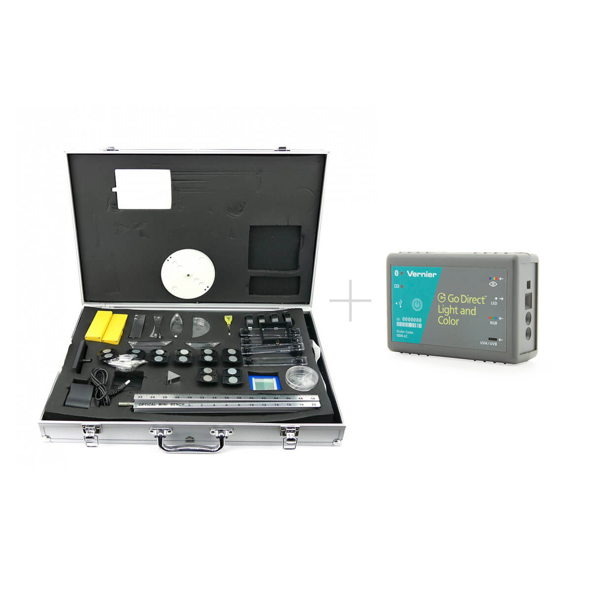 Представлений набір «Геометрична і хвильова оптика» включає в себе все необхідне обладнання для проведення 16 лабораторних робіт в групах з 2-4 учнів + датчик світла та кольору Vernier Go Direct, який підключається до будь-якого смартфона/планшета/комп'ютера.