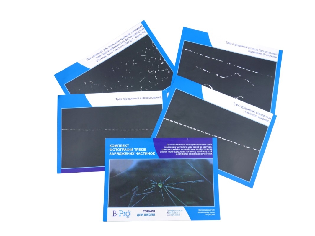 Комплект фотографій треків заряджених частинок використовується в кабінеті фізики загальноосвітнього навчального закладу. Призначений для вивчення розділу "Ядерна фізика", як дидактичний матеріал для проведення лабораторної роботи.