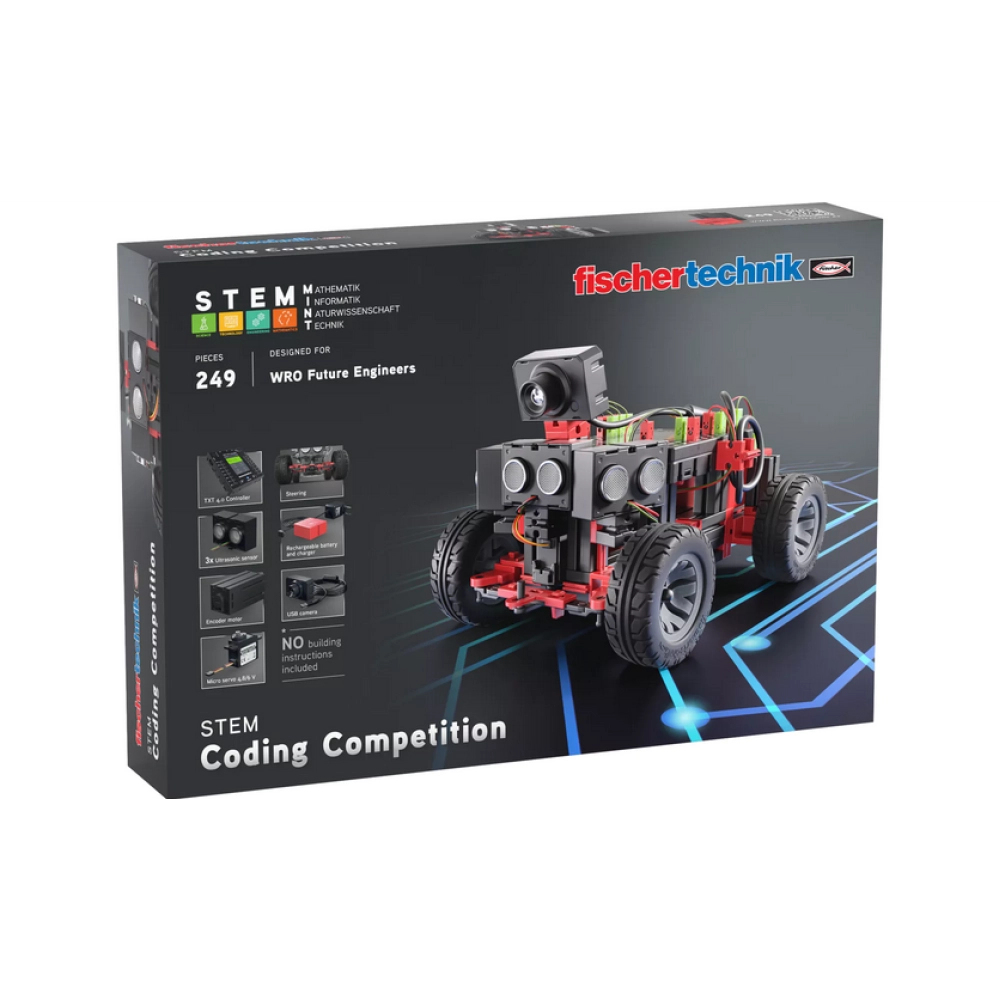 Fischertechnik STEM Coding Competition - це спеціалізоване рішення, що містить усе необхідне для конструювання та програмування автономного роботизованого автомобіля. Набір створений для того, щоб учні могли впевнено проходити складні траси та перемагати у професійних перегонах роботів.