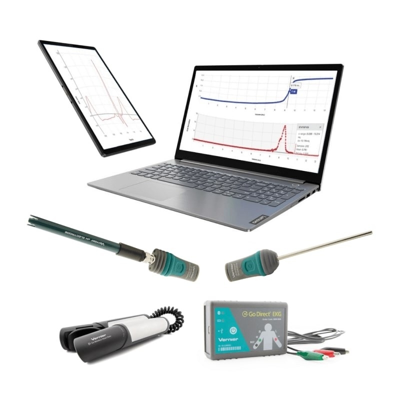В состав комплекта входят четыре высокоточных датчика Vernier с беспроводной технологией передачи данных Go Direct с помощью bluetooth-связи.