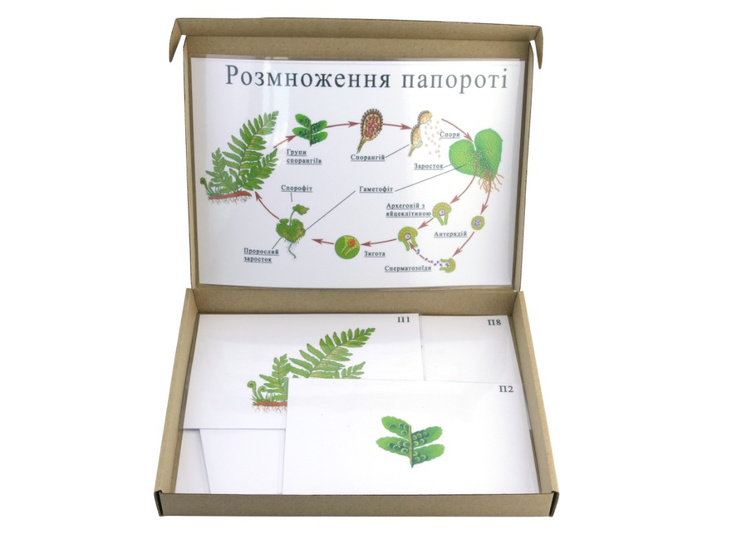 Данное учебное пособие состоит из набора карточек, на которых проиллюстрировано устройство и этапы размножения папоротника.