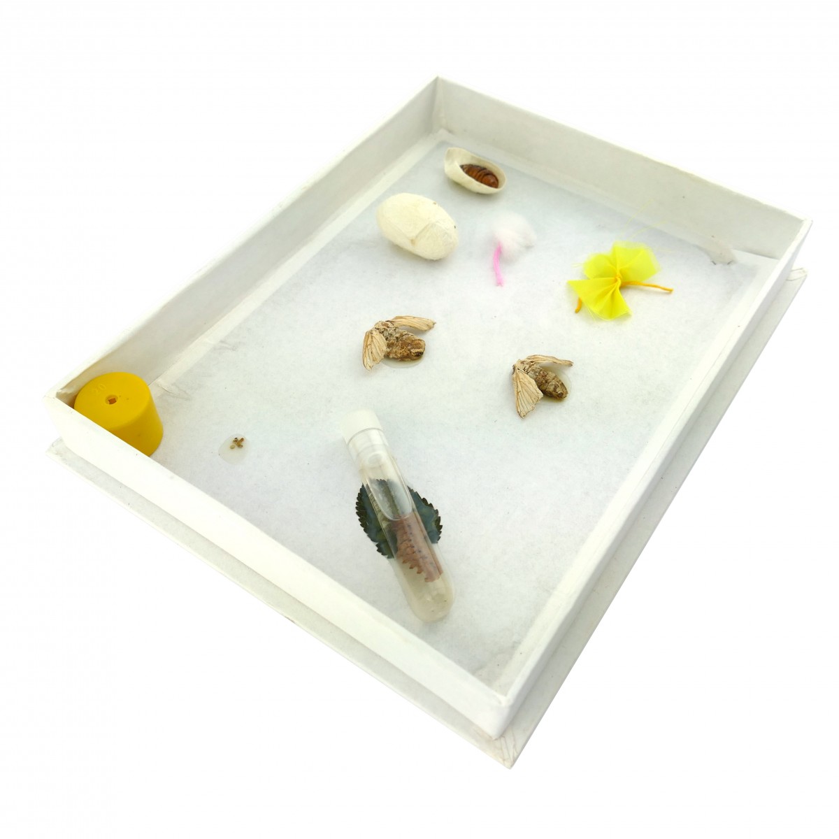 Учебная коллекция с образцами различных этапов развития шелкопряда используется при изучении темы "Насекомые" для детального исследования особенностей насекомых с полным превращением.