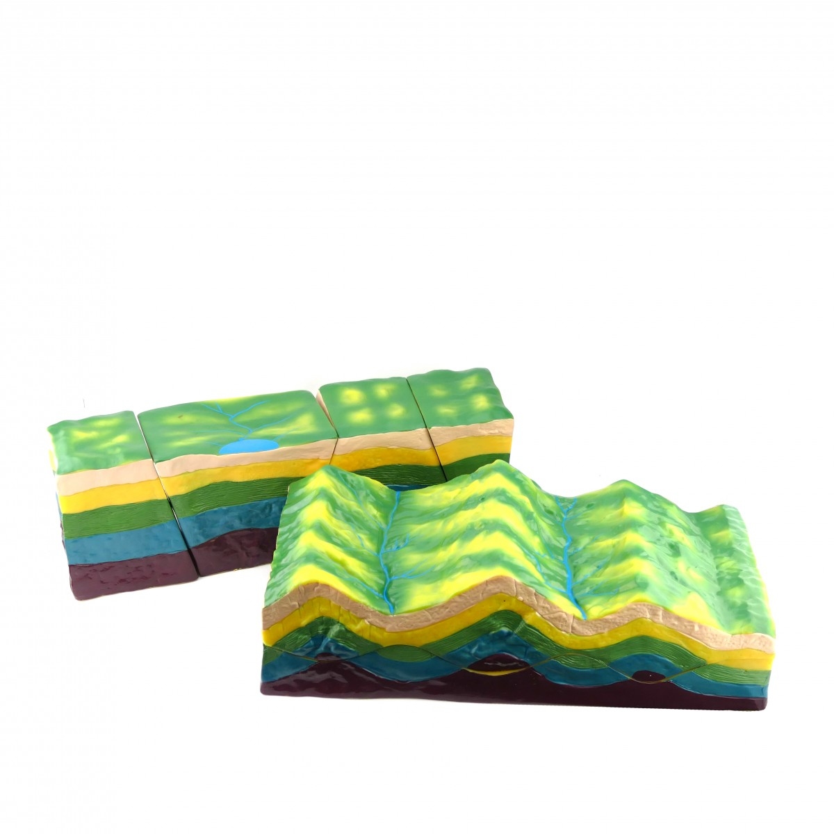 Объемная модель для кабинета географии, демонстрирующая эволюцию рельефа и особенности строения земных складок, используется в учебных заведениях для начального знакомства с понятием рельефа Земной поверхности и дальнейшего исследования различных форм и типов рельефа.