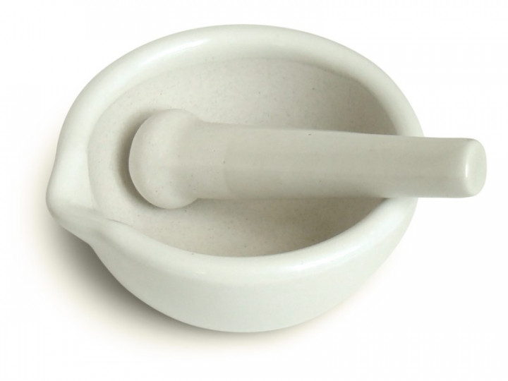 Небольшая фарфоровая ступка с пестиком применяется при проведении опытов (демонстрационных или лабораторных), для которых нужно быстро измельчить небольшое количество твердых веществ.