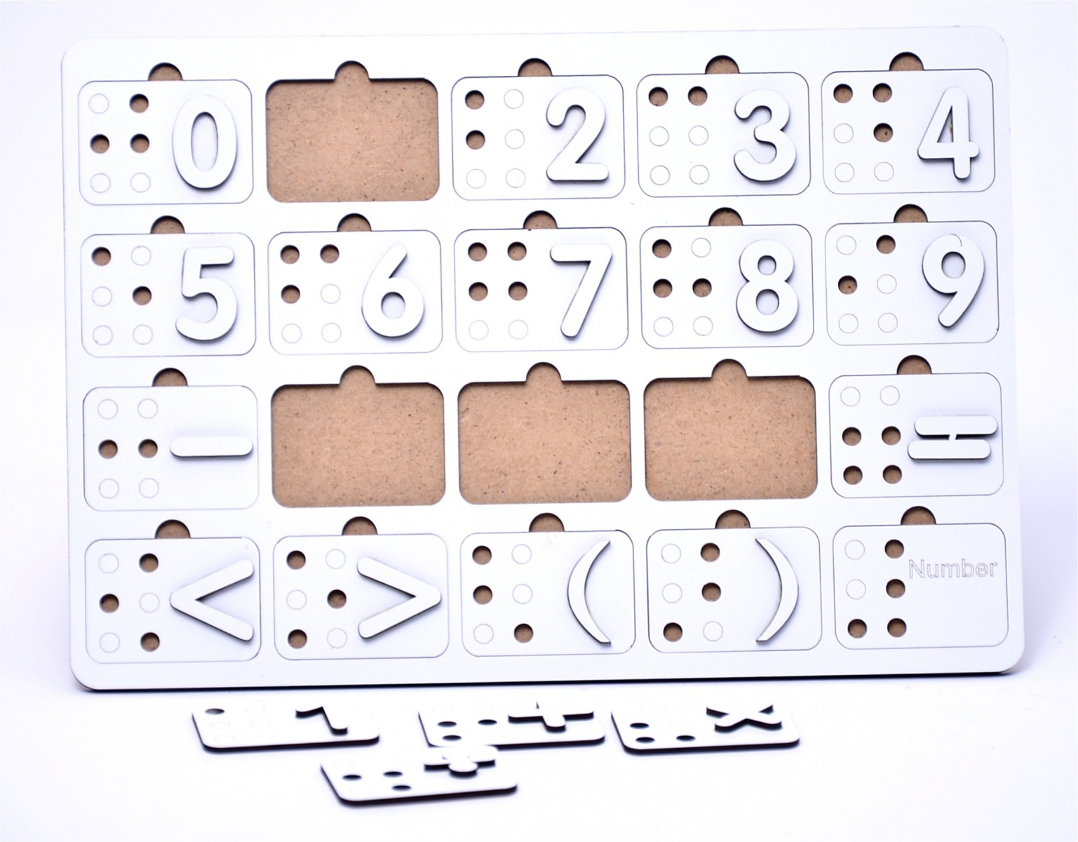 На каждую карточку набора нанесено (в виде углубления) шеститочечный шрифт Брайля, а также тактильные (выступающие) цифры и арифметические знаки.