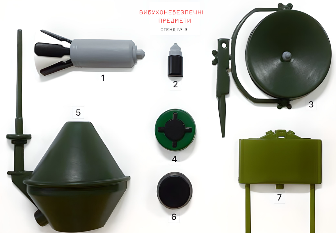 На стенде Взрывоопасные предметы. Тип 3” находятся объемные макеты наиболее распространенных мин, боеприпасов и снарядов, а именно: