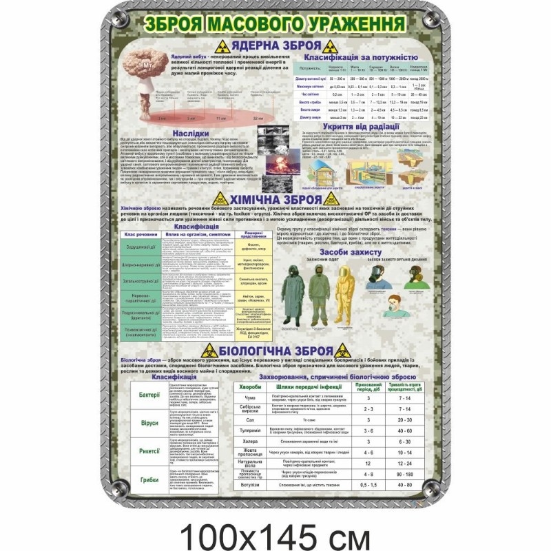 На качественном вертикальном стенде 100х145 см содержится подробная информация о ядерном оружии массового поражения: определение и классификация по мощности ядерных взрывов, их возможные последствия и особенности укрытия от радиации. Кроме того, стенд содержит детальную классификацию различных видов химического и биологического оружия массового поражения, средства защиты и последствия для здоровья человека.