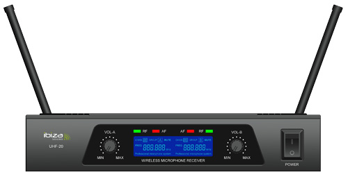 - беспроводной двухканальной UHF-микрофонной системы с двумя портативными микрофонными трансмиттерами и двухканальным ресивером с LCD дисплеем;