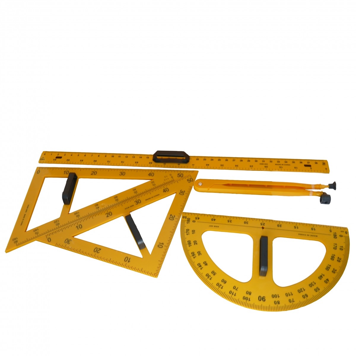 Все необходимое вы найдете, заказав этот замечательный набор. Удобные треугольники, угломер, линейка и циркуль большого размера. Еще у них есть ручки, за которые легко держать инструмент. Вы сможете начертить необходимые геометрические фигуры, изображения, графики и измерить значения углов.