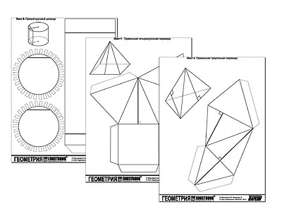 В данном наборе собраны листы, формата А-4 с развертками различных пространственных фигур. Всего в одном комплекте их 11 штук.