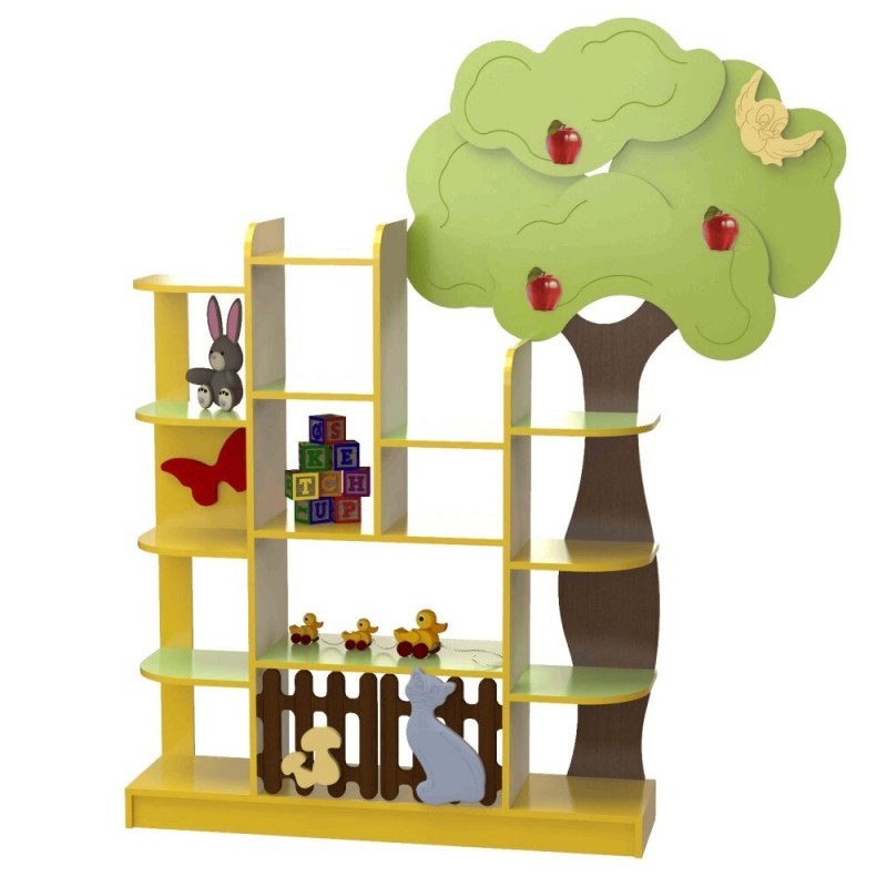 Стенка имеет 16 полочек, это позволит организовать хранение большого количества книг, игрушек и других необходимых материалов. Удобно то, что она ориентирована на использование ребенком, то есть ребенок сможет самостоятельно взять необходимый предмет и вернуть потом его на место.