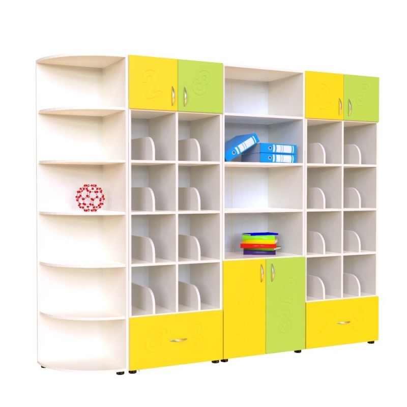 вместительная и продуманная система полок и шкафчиков для хранения всех необходимых учебных материалов.