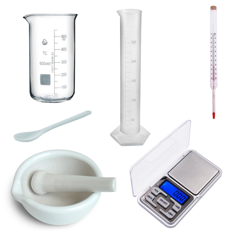 - Стаканы с носиком, измерительные цилиндры, стаканы, фарфоровые ложки и другое лабораторное оборудование