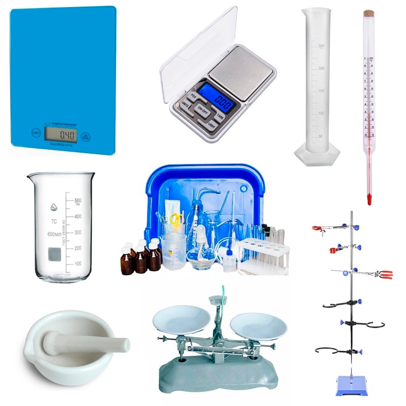 - Посуда и оборудование для опытов: стаканы с носиком, измерительные цилиндры, стаканы с носиком, набор лабораторный демонстрационный для опытов по естествознанию и т.д.