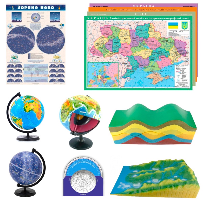 - Географические карты: физическая карта Украины, тектоническое строение и полезные ископаемые, карта звездного неба, физическая карта мира.