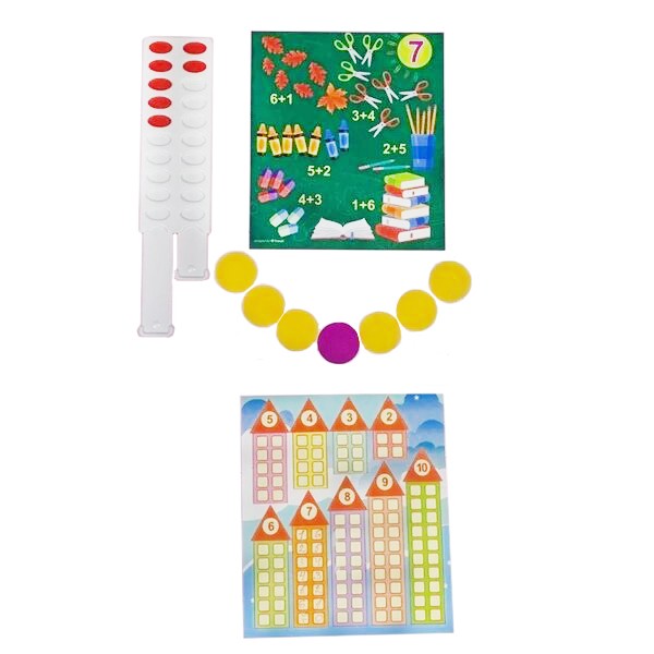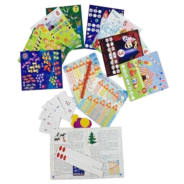 - 9 двусторонних карточек, размером 140х160 мм для иллюстрации состава числа и практической работы;