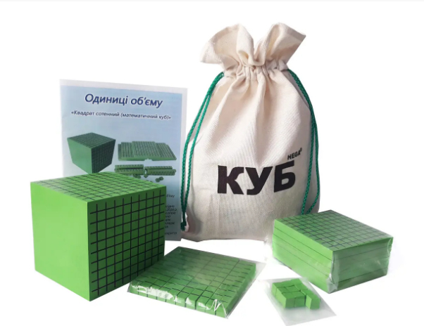 Модель представляет собой деревянный куб со стороной 10 см, на две грани которого нанесена сетка 1х1см, также 5 фрагментов 10х10х1см, один из которых составляет десятую часть куба, 10 фрагментов 1х1х10 см, один из которых составляет десятую часть фрагмента куба 10х10х. фрагментов – единиц объема –1см3.