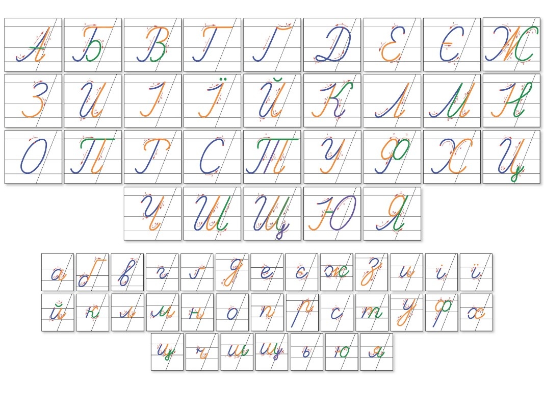 - 33 карточки размером 64 мм х 55,5 мм, с образцами написания строчной буквы.