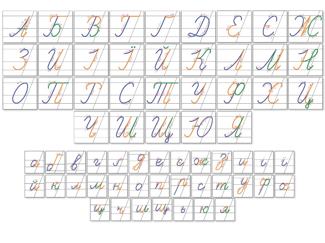 - 32 карточки размером 98 мм x 91,2 мм, с образцами написания большой буквы;