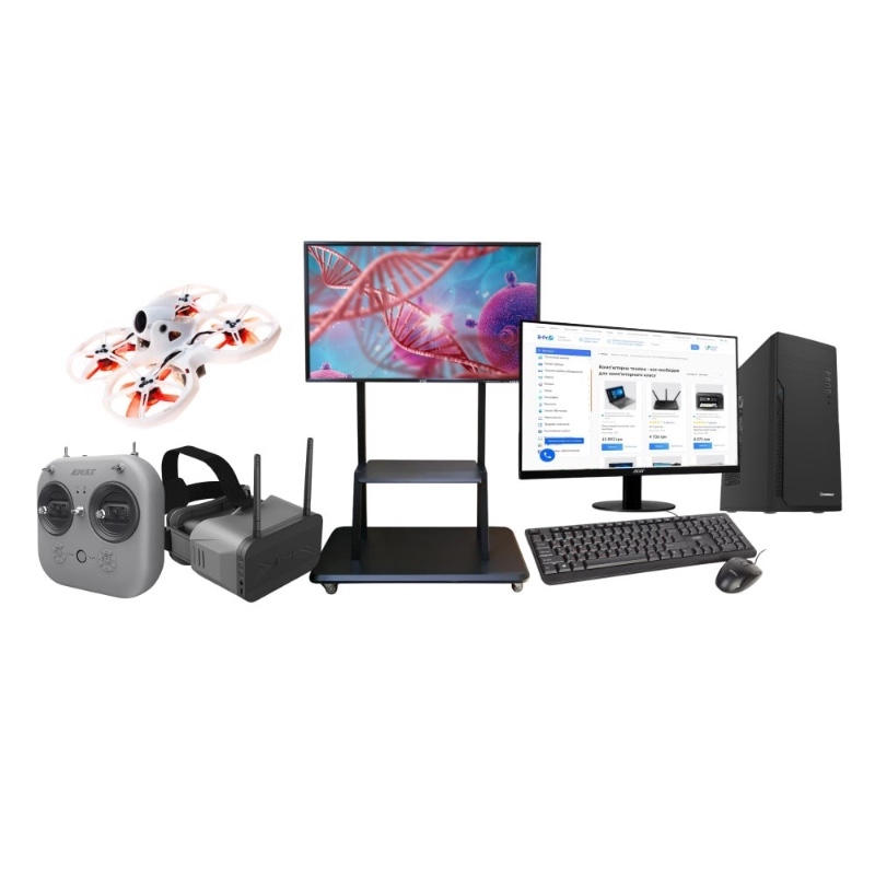 - Рабочее место учителя-инструктора: компьютер учителя с программным обеспечением, радиопульт для работы с симулятором, комплект для практических полетов (дроны, очки, пульт), интерактивный дисплей 65" для отображения и контроля учебного процесса учеников.