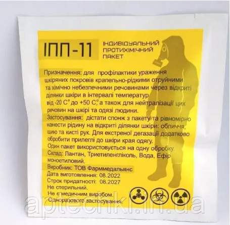 Индивидуальный противохимический пакет предназначен для профилактики кожно-резорбтивных поражений капельно-жидкими ядовитыми и аварийно-химическими опасными веществами через открытые участки кожи, а также для дезагации этих веществ на коже и одежде человека и инструментах в интервале температур от -20 до +50. При раннем нанесении на кожу защитный эффект сохраняется в течение 24 часов.