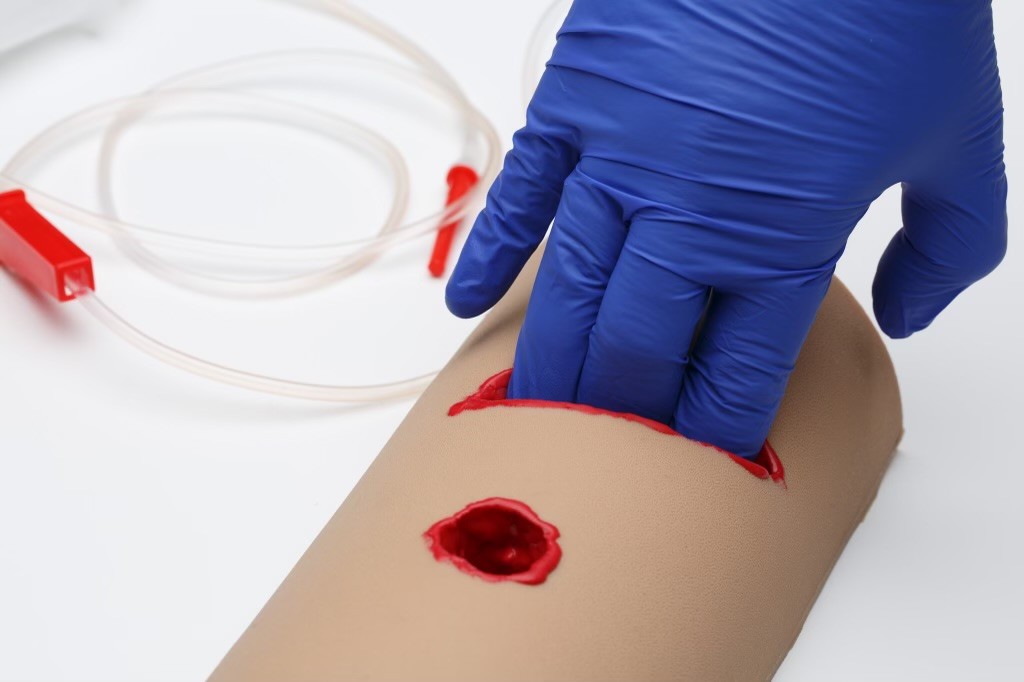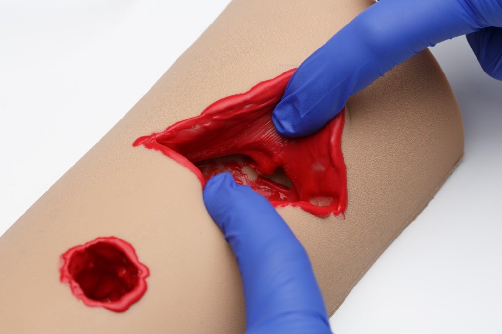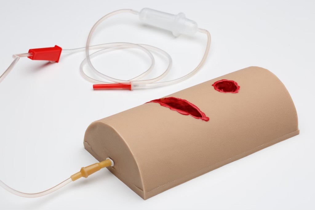Тренажер для тампонирования раневого канала выполнен из высококачественного силикона, имитирующего мягкие ткани. На тренажере представлены 2 типа ран: шаровое ранение и рваная рана. На дне ран находятся сосуды с отдельной подачей имитатора крови. Сосуды подсоединяются к флаконам с имитатором крови с помощью инфузионных систем. В качестве флаконов можно использовать обычные ПЭТ-бутылки (от воды). Под сосудами есть имитация кости, к которой можно прижать сосуд. На дне "рваной" раны есть "карман".