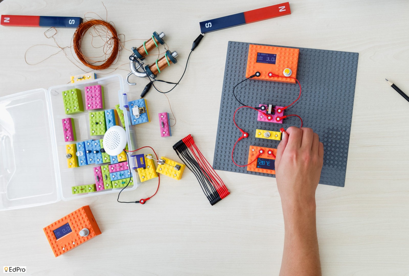 Все блоки выполнены в виде ярких кубиков, которые закрепляются на удобной основе. Поэтому строить сложную электрическую схему теперь так же просто, как составлять любимый конструктор.