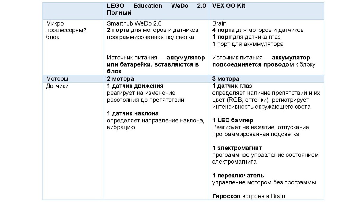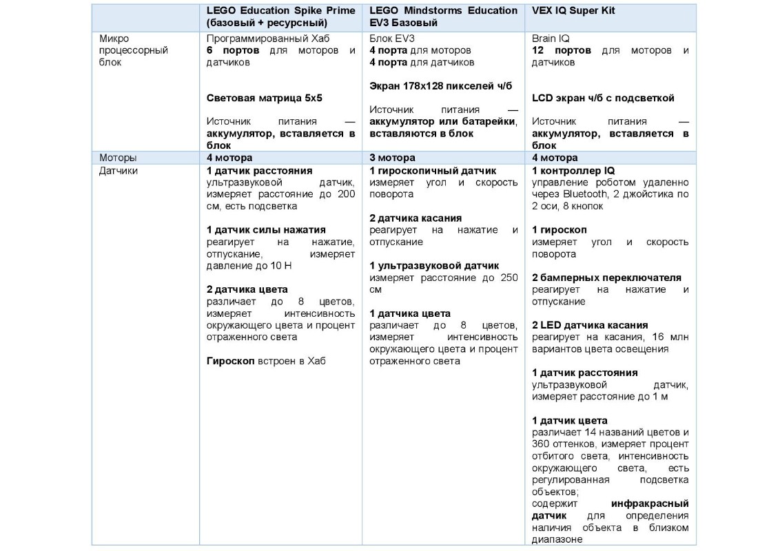 Поскольку почти все рассмотренные наборы, несмотря на рекомендации производителей, используются и детьми младшего возраста, то сравнительные таблицы сформируем, учитывая реальную практику использования наборов в школах.