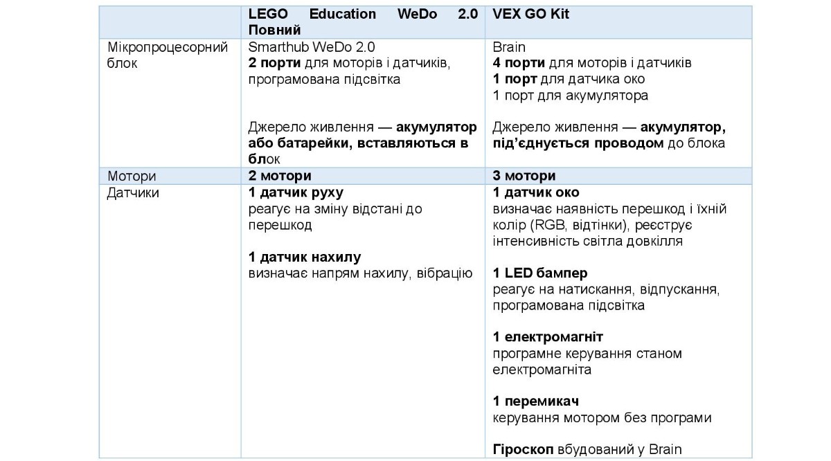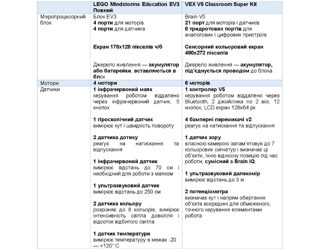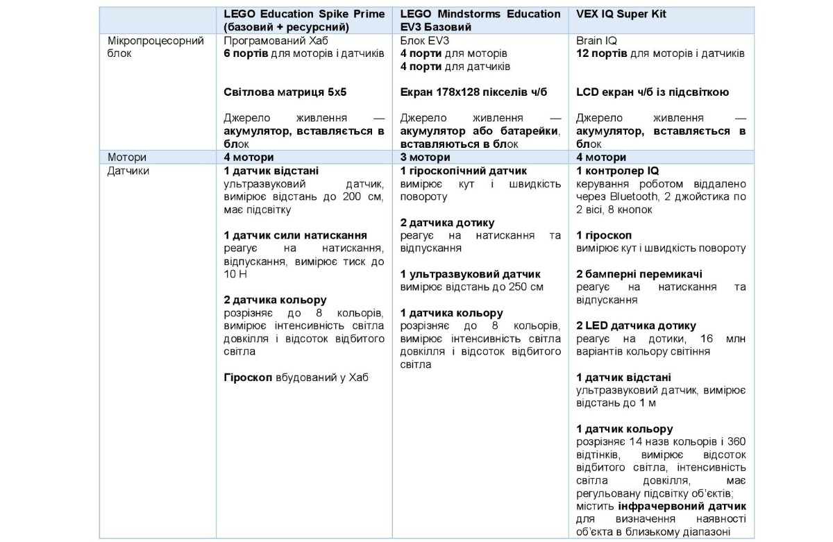 Оскільки майже всі розглянуті набори попри рекомендації виробників використовуються й дітьми молодшого віку, то порівняльні таблиці сформуємо, зважаючи на практику використання наборів у школах.