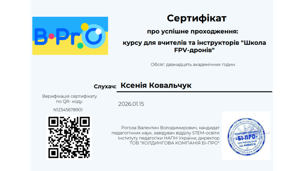 Формат курсу дозволяє вчителям не лише самостійно пройти курси FPV дронів онлайн та опанувати необхідні знання та навички, але й отримати офіційний сертифікат по завершенню курсу, а також - методичну основу для подальшого викладання та навчання учнів.